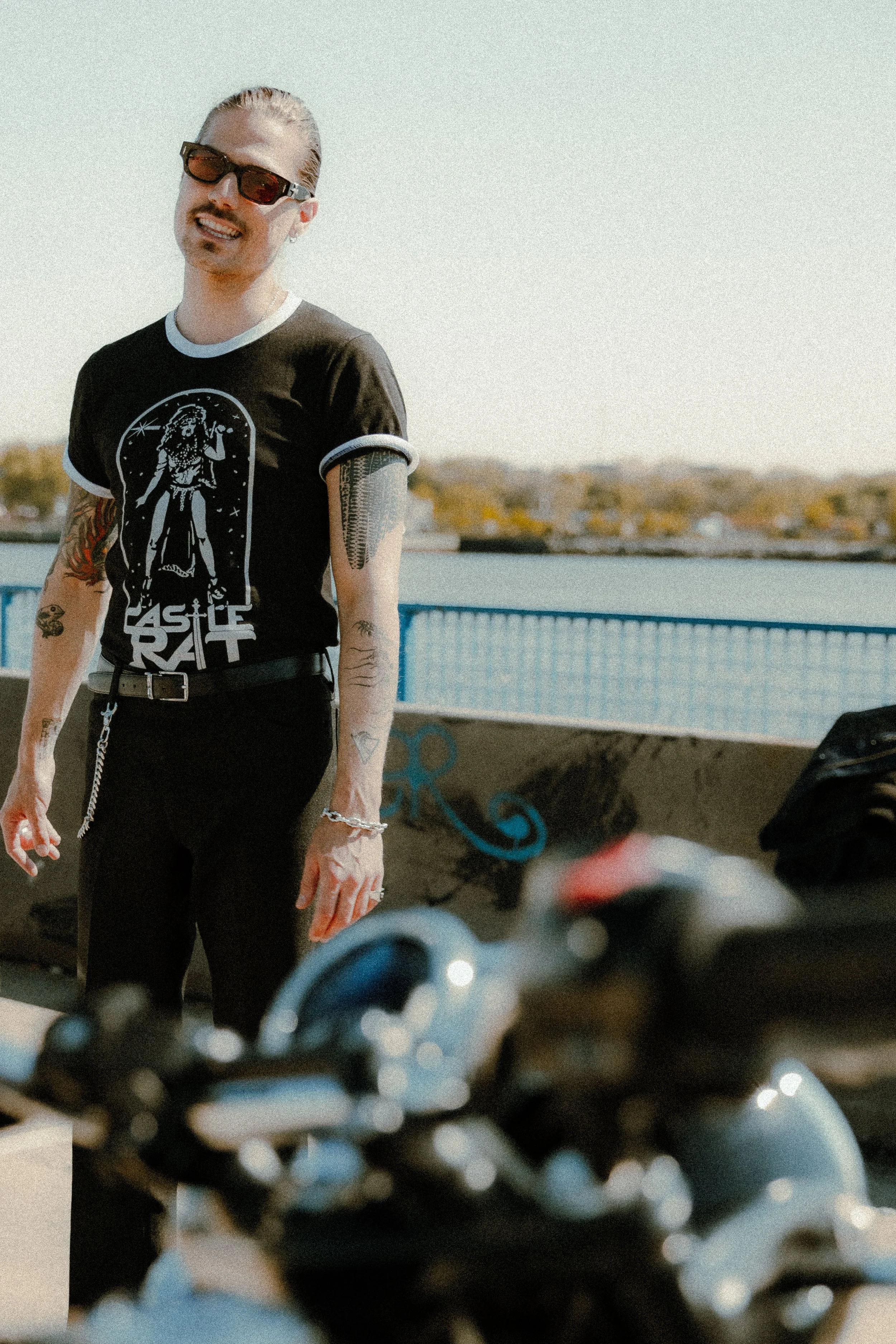 Person with tattoos wearing a black t-shirt and sunglasses standing outdoors with a motorcycle in the foreground.