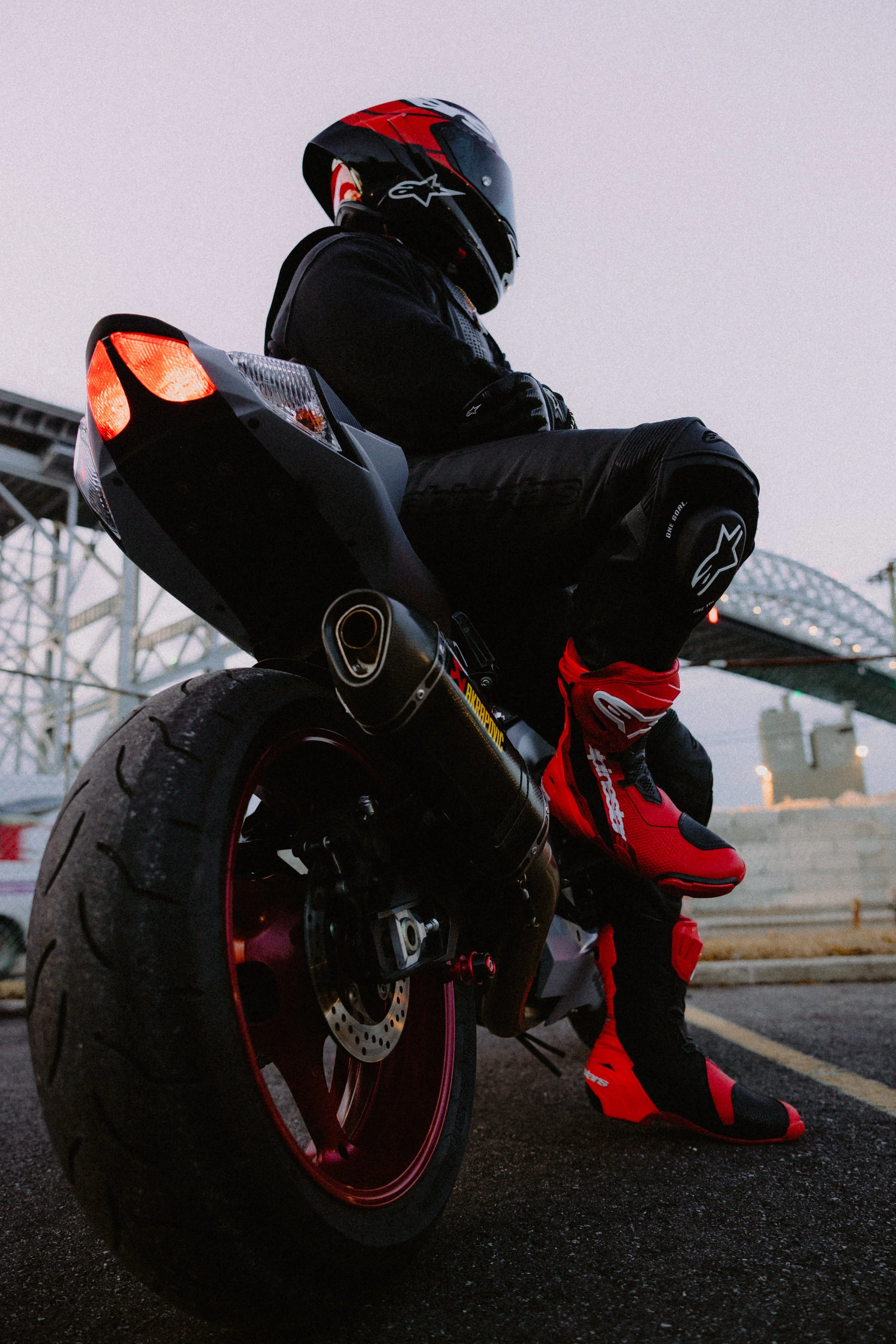 Motorcyclist wearing protective gear and helmet, sitting on a sportbike beneath a large bridge, with glowing brake lights and vibrant boots.