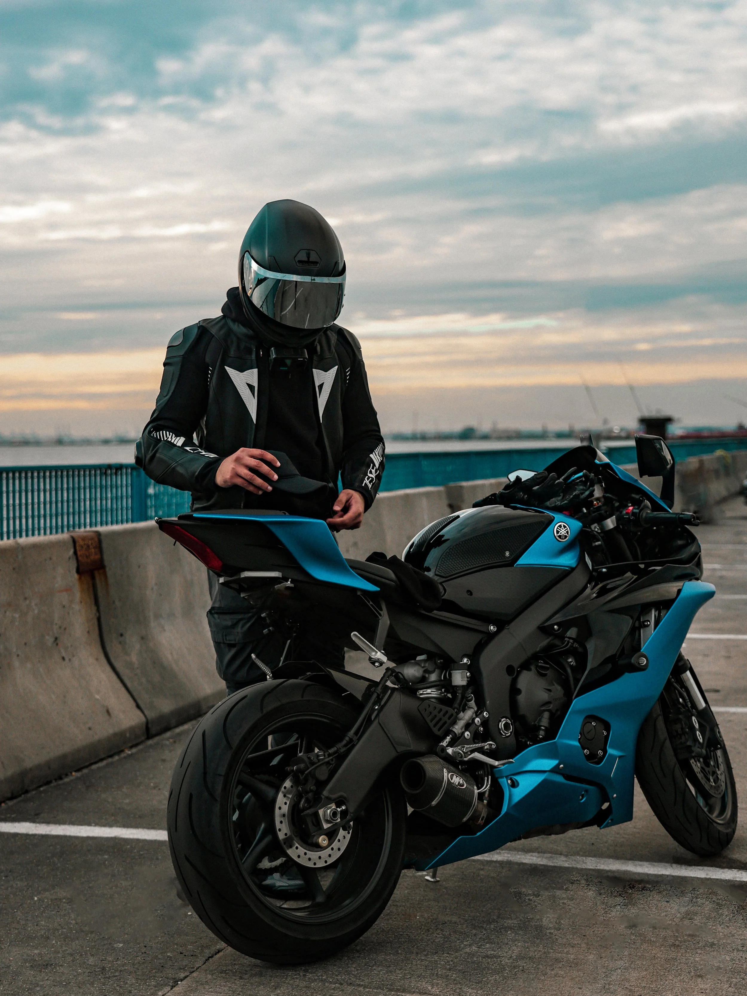 Person wearing helmet and gear standing next to a blue and black sport motorcycle on a rooftop parking lot.